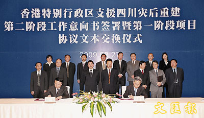 在儀式上,特區政制及內地事務局常任秘書長羅智光與四川省發展和改革委員會主任劉捷,簽署了《就香港特區第二階段支援四川地震災後恢復重建工作的意向書》,並交換一些首階段項目的《項目合作安排》文本。