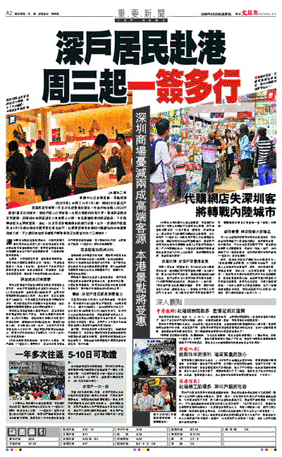 【本報珠三角新聞中心記者熊君慧、李昌鴻深圳28日電】本周三(4月1日)起,深圳230多萬名戶籍居民將可辦理一年多次往返香港的簽注。作為內地首個人均GDP超過1萬美元的城市,深圳戶籍人口無疑是一支實力強勁的消費大軍。香港商家聞訊喜笑顏開,而深圳本地商家卻多少有些愁上心頭,有走高端路線的商家擔憂,下月開閘後將失去兩成客流,為此,許多百貨零售業提前掀起打折戰。此外,非深圳戶籍居民自5月1日起也開始全面享受赴港自由行,此舉直接導致有深圳代購網站的本地客源銳減八成,不少網店被迫把目標客戶群重新鎖定在粵省外的二三線城市。