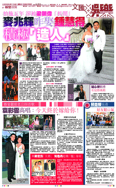 【本報訊】(記者 寧寧)昨日是好日子,女星袁彩雲和導演麥兆輝都在同一天舉行婚禮。導演麥兆輝與拍拖五年、任職巿場公關的女友鍾慧得「拉埋天窗」,他選擇伯大尼演藝學院古蹟校園行禮,希望可以close一些,晚上一對新人在深灣遊艇會筵開二十席宴客。麥兆輝揚言婚後會積極造人,因覺得生命是要一代一代延續下去的。整個婚禮花費近七位數字。