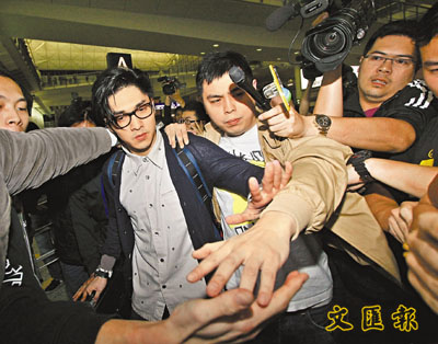 ■關楚耀現身接機大堂,即遭傳媒包圍。 本報記者彭子文 攝