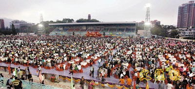 ■為祝賀新界鄉議局主席劉皇發獲特首委任為行政會議成員,鄉議局暨二十七鄉鄉事委員會在元朗大球場舉行1,600多圍的「盆菜宴」,合共有近2萬人出席。本報記者梁祖彝 攝