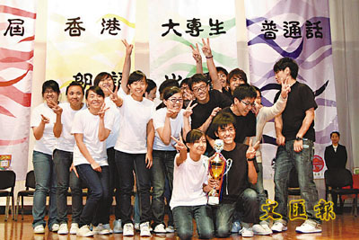 「第8屆全港大專生普通話朗誦比賽」昨日於樹仁大學舉行決賽。來自香港8間大專院校25名學生及10支隊伍進入決賽。圖為集誦的得獎隊伍。