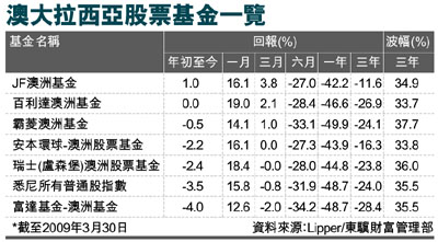 現時於理柏環球的分類當中,並沒有澳洲股票基金的分類,而澳洲股票基金一般屬於澳大拉西亞股票基金的分類當中,(澳大拉西亞一般指澳大利亞、新西蘭及附近南太平洋諸島,有時也泛指大洋洲和太平洋島嶼)。根據理柏的分類,坊間現時共有6隻澳大利亞股票基金,其中以JF澳洲基金於同儕中表現最為理想,該基金年初至今錄得正數回報,三月回報則錄得3.8%的回報,相信與其基金經理早前因避險而採取的防守部署有關。截至今年2月,該基金主要投資於物料、金融,分別佔總投資額的24.7%及19.1%。