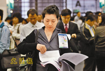 「2009年全球採購夥伴大會」31日在台北世貿展覽館舉行,台灣製造商帶著資料在展館找機會。 中央社