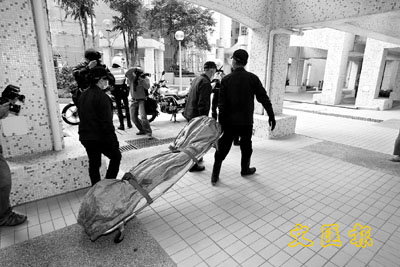■富強苑燒炭女子屍體由仵工舁送殮房。本報記者蔣焯文 攝