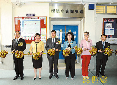 ■董玉娣中學日前舉行「劉陳小寶圖書館」命名典禮,梁兆強(左三)、保良局主席兼校監顏顏寶鈴(左二)、劉陳小寶(右三)等人主持剪綵儀式。