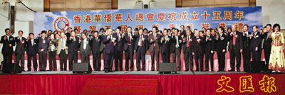 【本報訊】(記者 陳巧顏)香港華僑華人總會日前假九龍灣國際展貿中心,慶祝成立15周年及理監事就職典禮,筵開80席,逾千名僑界名流、社會賢達到賀,並見證該會第5屆理監事上任。大會榮邀中國僑聯主席林軍,國僑辦副主任許又聲,外交部駐港副特派員楊子剛,中聯辦協調部部長王永樂,立法會主席曾鈺成,全國僑聯副主席、香港僑界社團聯會主席陳有慶,香港僑界社團聯會會長余國春,香港友好協進會主席陳永棋蒞臨主禮。