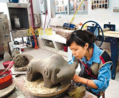 ■深職院學生創新創業中心工作室中,一位學生在認真雕塑作品,這些作品有些還作為學校的外送禮物,成為學校的「品牌產品」。 本報記者李望賢 攝