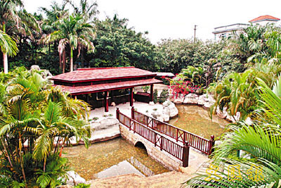 ■露天溫泉區中,亭台樓閣、瀑布迴廊錯落其間。