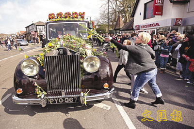 ■曾令全英電視觀眾震驚的古迪,載住其靈柩的汽車獲小孩致送道別花束。 法新社