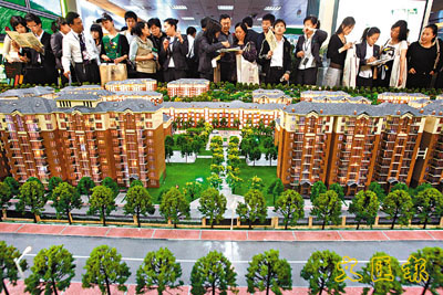 ■北京房地產3月份的成交量環比增長91.4%,有人認為是房地產市場走出低谷的標誌。圖為北京樓盤售樓展銷會。 法新社