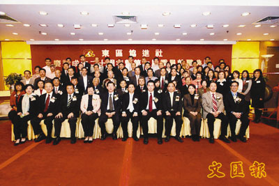【本報訊】東區協進社日前在香港北角新都會大酒樓舉行20周年會慶暨第7屆委員就職典禮。中聯辦港島工作部副部長陳幟彬,港區人大代表蔡素玉,東區助理民政專員謝凌駿,東區區議會副主席鍾樹根,東區警民組主任李雅明,東區各界協會會長曾向群議員為活動主禮,當晚有450人出席,場面熱鬧。
