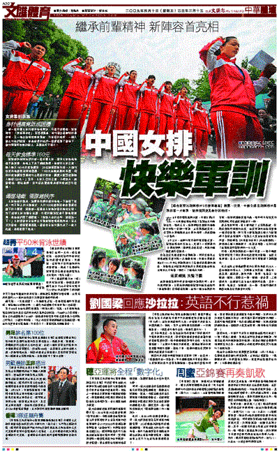作為北京奧運會後的首輪集訓,同時也是新主帥蔡斌執教後的第一次集體亮相,中國女排國家隊8日─11日的公開訓練吸引了全國多家媒體的關注。蜂擁而至的記者們更是將女排隊員能在基地出現的大小角落「埋伏」了個滴水不漏。
