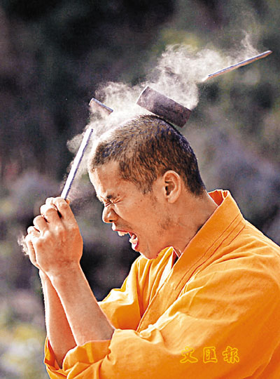 少林武僧前日在福建泉州少林寺展示「神功」:鐵頭擊碎鐵塊。路透社