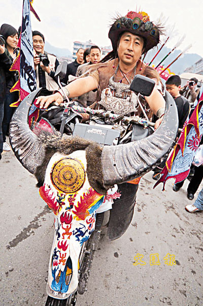 貴州苗族民眾9日歡度姊妹節,一名青年用牛角將鐵騎改裝成「最牛電單車」。新華社
