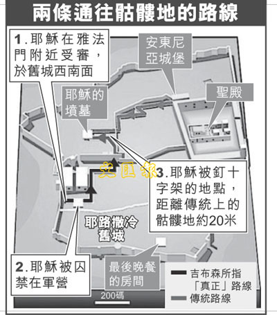 過去千多年,無數朝聖者到耶路撒冷重踏耶穌走到生命盡頭的「苦路」,但考古學家吉布森聲稱,信徒一直行錯路,還弄錯了「苦路」上兩個神聖地點,包括路線起點及耶穌被釘上十字架的地方(即骷髏地)。