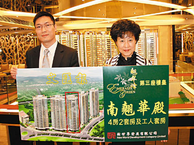 ■新世界發展代理執行董事何伍燕榆(右)與新世界發展營業及市務經理劉仲良,在尖沙咀新世界中心推介元朗翹翠峰。 本報記者周穎 攝