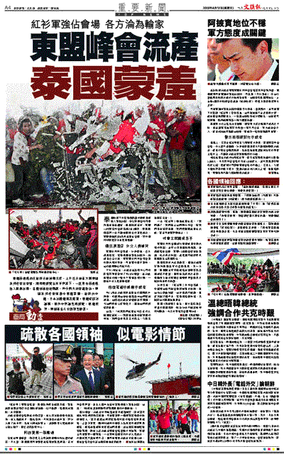 泰國芭堤雅的反政府示威浪潮失控,上千名示威者大鬧東盟系列峰會主會場,總理阿披實在束手無策下,一度宣布芭堤雅進入緊急狀態,各國領袖紛紛撤離,昨今兩天的會議取消。東盟系列峰會流產令泰國蒙羞,政府向中國、日本和韓國深表歉意。泰國媒體評論稱,事件中無論是阿披實、泰國民眾、東盟等各方全部都是輸家。