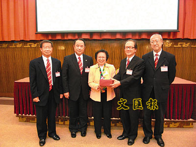 ■中總首長袁武、張成雄、余鵬春、黃守正致贈紀念品予譚惠珠。
