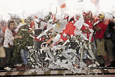■「紅衫軍」打破東盟系列峰會會場(皇家克里夫酒店)的玻璃門。 路透社