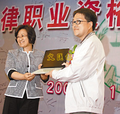 ■國家司法考試司司長丁露(左)為通過司法考試的台胞頒發《法律職業資格證書》。 本報記者 林舒婕 攝