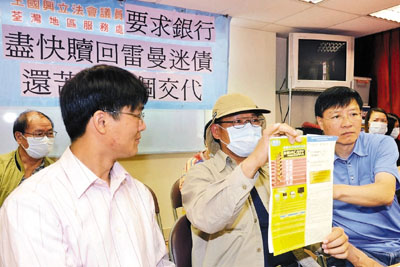 ■雷曼小苦主與王國興會見傳媒,展示銀行投資單張,批評銀行拖延處理回購。本報記者李志樑 攝
