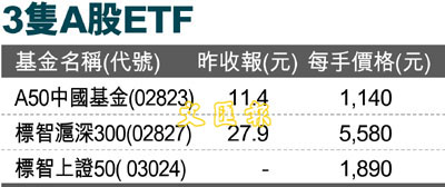 【本報訊】若連同今日(15日)上市的標智上證50指數基金(03024),市場上有3隻上市的A股ETF可供選擇,投資者宜選擇自己較容易理解或掌握相關資產變化的ETF為佳,因此必先了解3隻A股ETF的分別和定位。
