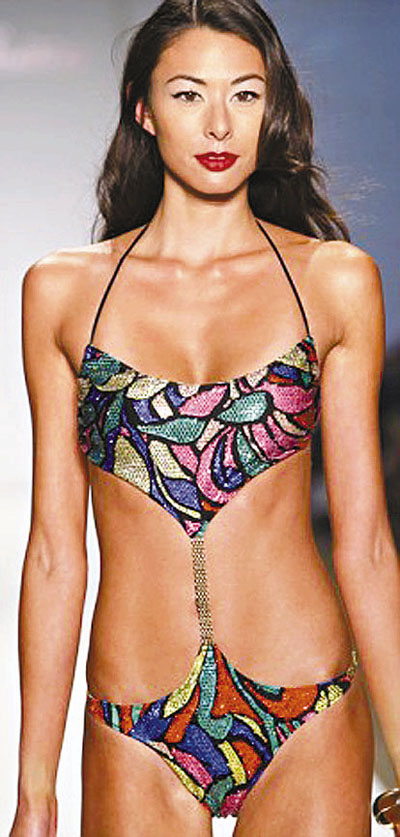 Selfridges百貨公司與時尚泳裝生產商Pistol Panties合作,推出這款炫目的泳衣,共鑲有5,000顆不同顏色的水晶,代表著紅寶石、藍寶石、綠寶石和黃金,比堅尼上下兩截由一條鑲上金色水晶的帶子連接。 ■《每日郵報》