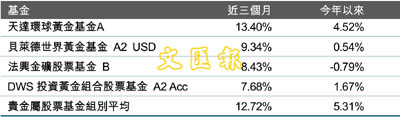 ¡@°òª÷¤T¤j¸ê²£¤ñ«ªÑ²¼¬°7.44% Gold Fields Ltd.¡B6.85% Barrick Gold Corp.¤Î6.8% Newmont Mining Corp.¡C