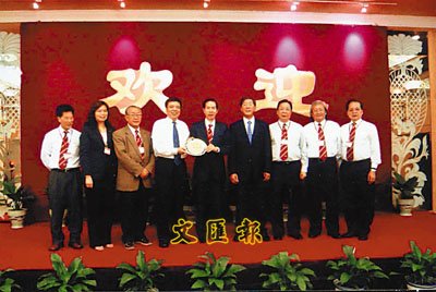廈門市政協主席陳修茂,統戰部部長歐陽建與盧文端一行互換紀念品。