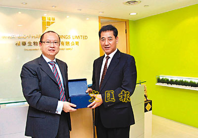 ■雲南省招商合作局副局長孟昭華(右)率「港洽會重點項目推進小組」與香港積華生物醫藥控股有限公司副主席兼行政總裁劉建彤(左)座談後互贈紀念品。