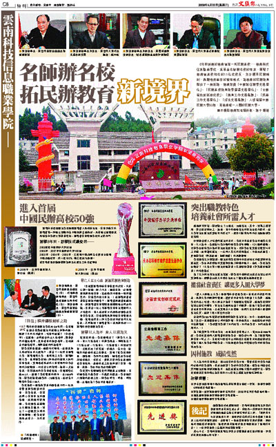 8年前創建的雲南省第一所民辦高校—雲南科技信息職業學院,秉承著名師辦名校的理念,匯聚了雲南省高校知名的11位院校長,充分運用民辦機制,靠嚴格而靈活的管理模式,為雲南的民辦教育闖出了一條新路,連續榮獲「中國誠信辦學先進單位」、「民辦高校教育教學質量先進單位」、「全國首批創新型院校」、「德育工作先進集體」、「就業工作先進單位」、「招生先進集體」,入選首屆中國民辦大學50強,是雲南唯一入圍的民辦大學。