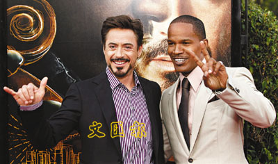 《The Soloist》昨日在洛杉磯舉行盛大首映禮,因片結緣的占美霍士和羅拔唐尼可謂惺惺相惜,在首映現場經常結伴同行,還一起默契地擺出V字手勢。等等,為何羅拔唐尼擺的是「六」的手勢(左圖)?另外,女星荷爾芭莉(右圖)也有到來,艷光四射的她就高舉五字手勢向大家打招呼。 ■文︰曼迪