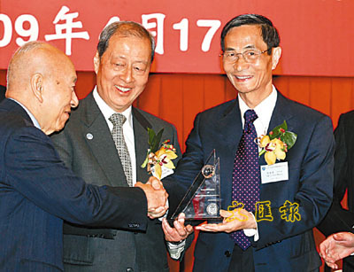 黎桂康(右)接受李達三和周亦卿致送紀念品。