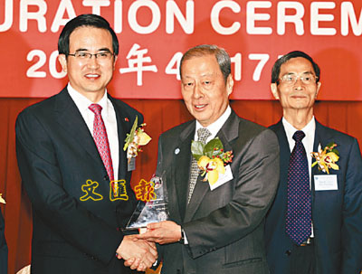 楊子剛(左)接受李達三和周亦卿致送紀念品。
