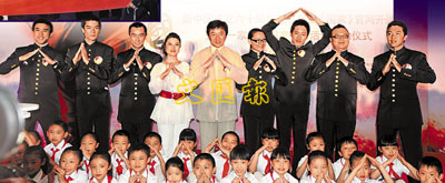 【本報實習記者 何凡、記者 李寶雯】建國60周年獻禮歌曲《國家》昨日在北京舉行官網開通儀式。主唱者成龍和劉媛媛不但身體力行出席宣傳,還不忘教大家手語版《國家》,場面熱鬧。成龍表示,落戶於新華網與新浪網的《國家》官網,將成為聯結廣大愛國愛家人士的紐帶,使更多人能通過此歌表達對建國60周年的美好祝願!