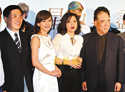 台灣電影《星月無盡》前日舉行首映會,演員楊貴媚(右2)、陳意涵(左2)、陳正偉和唐豐均有出席。但令人意外的是前行政院長郝柏村(右)和為台北市長的兒子郝龍斌(左)都有到來。原來該片以1970年代的金門為背景,而郝柏村當年曾在金門擔任第九師師長,所以想藉電影回味金門風情。■圖︰中央社