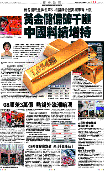 【本報記者卓建安、海巖24日電】國家外匯管理局局長胡曉煉24日透露,目前中國黃金儲備已達1,054噸,較03年公佈的600噸大幅增加75.67%,在各國公佈的黃金儲備中排名第五。受有關消息刺激,當天黃金現貨和期貨在亞洲交易時段應聲上升,維持在每盎司910美元左右,在香港上市的黃金股股價也大幅上揚,其中招金礦業(1818)大升9%,收市報10.9元。
