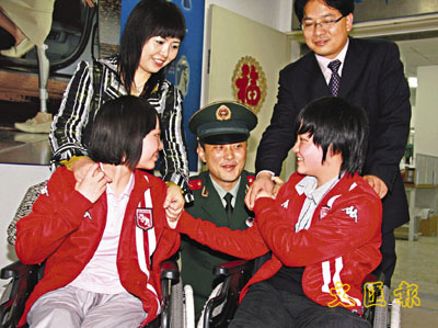 23日,地震傷殘少年蒲虹學(前左)和朱春燕(前右)在中國康復研究中心北京博愛醫院,與救命恩人—重慶消防總隊官兵欣喜相逢。 新華社