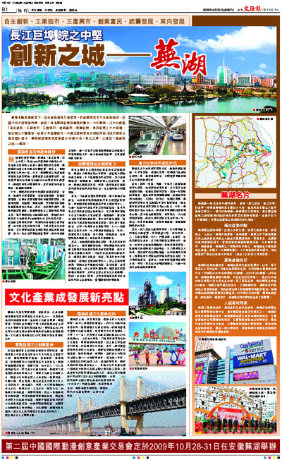 國際金融危機影響下,自主創新顯得尤為重要。安徽蕪湖從來不乏創新精神,從傻子瓜子到奇瑞汽車,創新一直是蕪湖發展的靈魂和動力。今日蕪湖,正大力推進「自主創新、工業強市、三產興市、創業富民、統籌發展、東向發展」六大戰略,綜合實力不斷增強,發展水平顯著提升。中國社會科學院日前發佈的《城市競爭力藍皮書》顯示,蕪湖經濟增長速度高居全球第10名。長江之畔,正崛起一座創新之城—蕪湖!