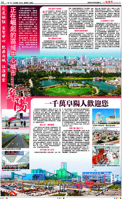安徽阜陽歷史文化悠久,交通區位優勢明顯,農產品和煤炭資源豐富,並擁有豐富的勞動力資源。依托良好優勢,阜陽發展迅速。2008年,阜陽全市生產總值突破540億元,比上年增長12%,連續5年保持兩位數增長;財政收入突破50億元,增長26.3%;城鎮居民人均可支配收入突破11,000元,農民人均純收入突破3,000元,分別增長8%和20%。阜陽正積極承接產業轉移,擴大招商引資,重點壯大工業和商貿物流產業,發展現代農業和縣域經濟,推動城鄉統籌發展,建設皖西北區域中心城市。
