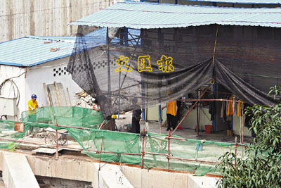 ■工人連夜在下陷處灌入泥漿。本報珠三角新聞中心記者敖敏輝 攝