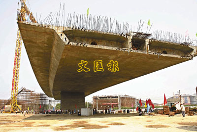 ■中國經濟去年採取的刺激經濟措施已初步見到效果。今年一季度GDP同比增長6.1%。圖為位於石家莊市的世界最大跨鐵路轉體斜拉橋成功轉體。 新華社