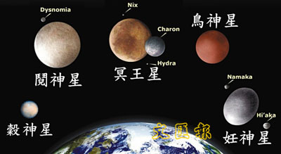 In 2006 the International Astronomical Union adopted a new astronomical term, dwarf planet, which defines a small spherical body that circles the sun in its own orbit. This brought the downfall of Pluto which formerly held the ninth planet name card. But nothing was more dramatic than reclassifying Ceres, precursor of the minor planet family. When Ceres was discovered in 1801 it was thought to be the missing planet that wandered between the orbits of Mars and Jupiter. Besides Pluto and Ceres, there are three newly discovered dwarf planets. They were Eris, Makemake and Haumea. The former two were found by Michael Brown's team of astronomers. Dwarf planets may be small but some of them have satellites of their own too(see picture above). ■甄枝強 資深天文愛好者