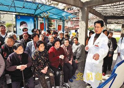 ■中國政府已對去年底推出的四萬億刺激方案作出微調,重心放在更多與社會福利相關的開支上,比如公共房屋、醫療護理、教育及失業保障等,以確保社會穩定,並刺激本地需求。圖為上海社區醫生向居民講解傳染病預防知識。 新華社