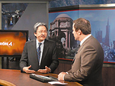 ■政府08至09財政年度盈餘14億元,較財政司司長曾俊華在今年2月公布的財政預算案的修訂預算中,提出會有49億元赤字,數字上明顯「轉虧為盈」。圖為曾俊華在三藩市接受傳媒機構KRON 4 TV訪問。