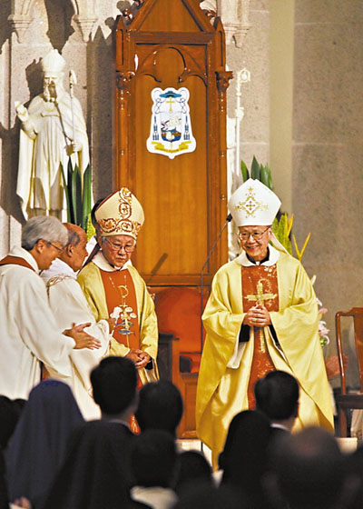 卸任主教陳日君亦出席了是次彌撒,在向教友表示感謝後,將職位正式移交給湯漢,又引領湯漢坐上主教座位,而各教會的神父則輪流向湯漢主教祝福。■本報記者曾慶威 攝
