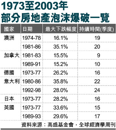 雖然美國樓市有復甦跡象,但大部分投資者所關心的是,樓價何時止跌回升呢?根據一項涉及15個國家的研究發現(上表),在過去30年裡,這些地區共經歷過29次房地產泡沫(以房屋實際價格下跌超過13%計算);根據統計,每一次泡沫爆破後的平均實際價格下跌幅為27%,平均時間為18個季度。以現時美國樓市來看,標普/Case-Shiller綜合房價由06年7月最高點已跌30.7%,由於該數字以名義價格計算,而名義價格一般均受通脹影響,故跌幅一般較實際為少。筆者以2000年1月消費物價作基準,發現標普/Case-Shiller綜合房屋實際價格,已由06年5月的最高點下跌了34.3%。 跌幅已大於上文提及的平均實際價格跌幅27%,雖然跌幅之相對足夠,但由於至今歷時僅10個季度,較平均的18個季度為短,故預計樓價下跌速度會放緩,但樓市是否見底,仍須以數據進一步分析。