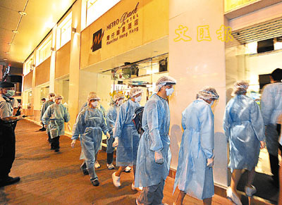 ■香港宣布出現首宗甲型H1N1流感確診個案後,患者曾入住的灣仔維景酒店需要封鎖。醫護人員全副武裝進入酒店為其他住客檢查身體。 法新社