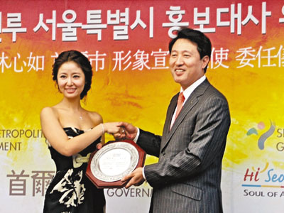 以電視劇《還珠格格》在韓國走紅的台灣女星林心如,昨日被首爾市長吳世勳任命為首爾市形象宣傳大使,希望藉著她的名聲,為首爾市的觀光購物宣傳代言。打扮性感的心如在委任儀式上表示,經常到首爾購物、旅遊,希望盡最大的努力在大中華地區宣傳首爾的魅力,認真賣口乖。■文︰若谷/圖︰中央社
